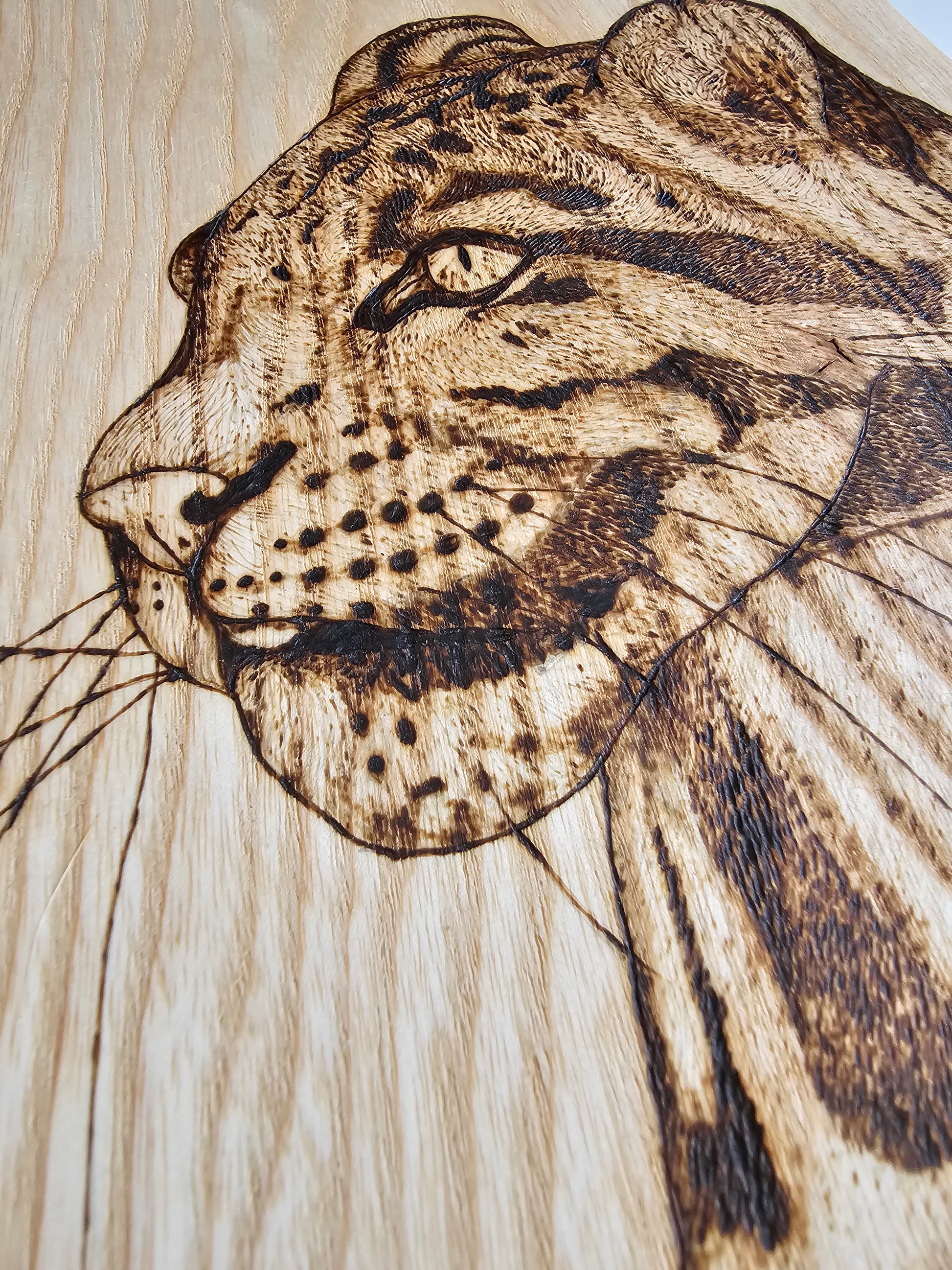 This wall art piece is of the amazing Bua the clouded leopard at the Big Cat Sanctuary. Hand pyrographed onto ash wood, highlighting the grain and character of the wood itself.
