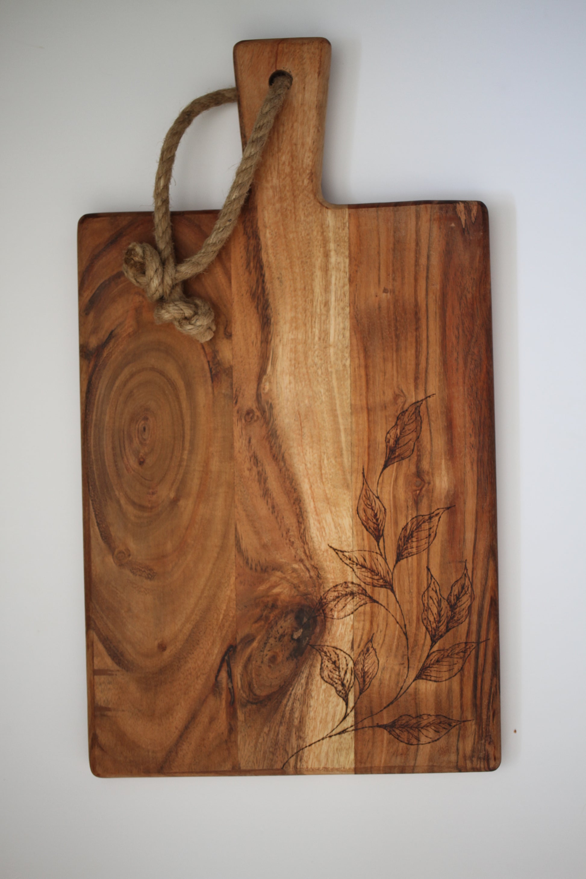 A leaf design hand drawn onto a acacia serving board and hand pyrographed in. Comes with thick rope through the handle.